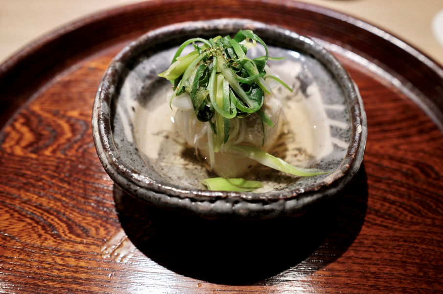 这个官名叫海胆寿司,网红名叫“海胆热狗”。海胆热狗主要是遵循茶料理突变出来的,在怀石料理里面是很少见这样的菜品的,这样的海胆寿司卷,汇集了之前在寿司店学到的技术,也融合了独有的怀石精髓。「富小路やま岸」海胆卷的海胆通常用的是北海道产的虾夷马粪海胆,当日吃到的也是如此,味道醇厚甘甜。除去北海道产的虾夷马粪海胆外,海胆卷也偶有使用由良产的赤海胆,有时又会是马粪海胆与赤海胆的两吃;究其原因是山岸对于海胆品质的执着,一定要将当日最好品质的海胆呈现给食客。